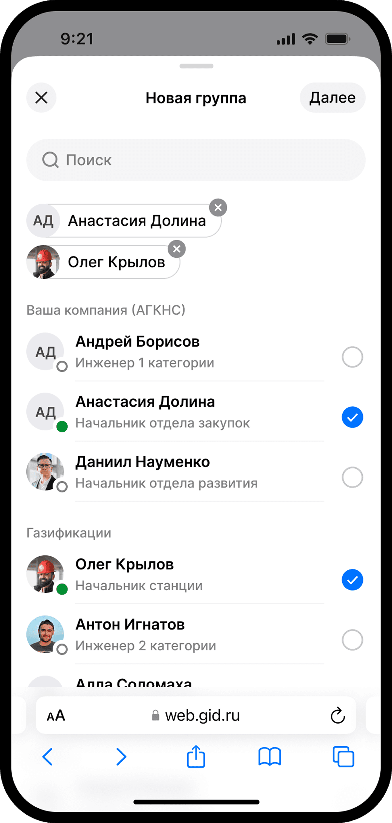 Если согласование требует участия нескольких коллег, прямо в разделе с чатами можно создать группу — участники подбираются по имени или должности. Все уже в системе, дополнительных приглашений не нужно.
