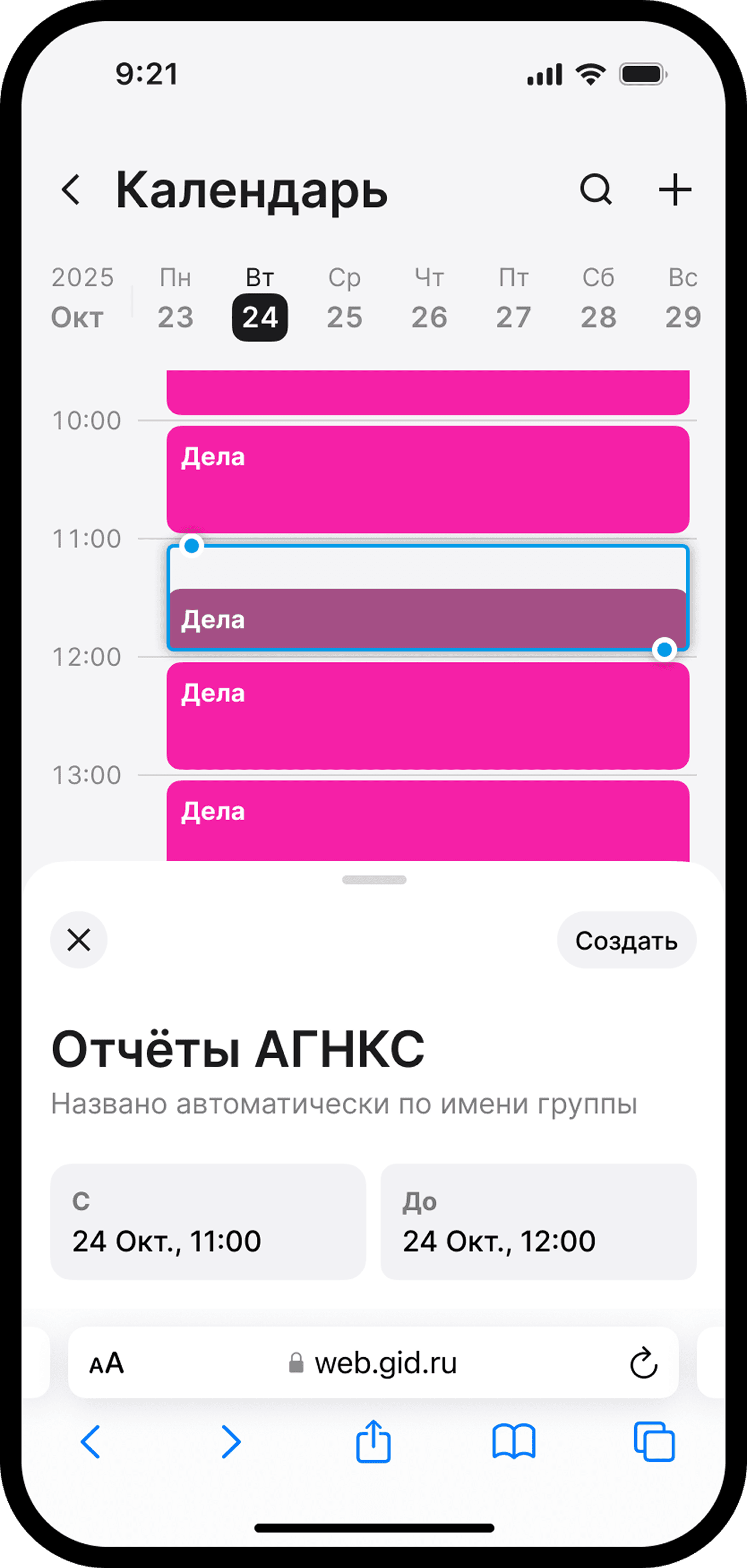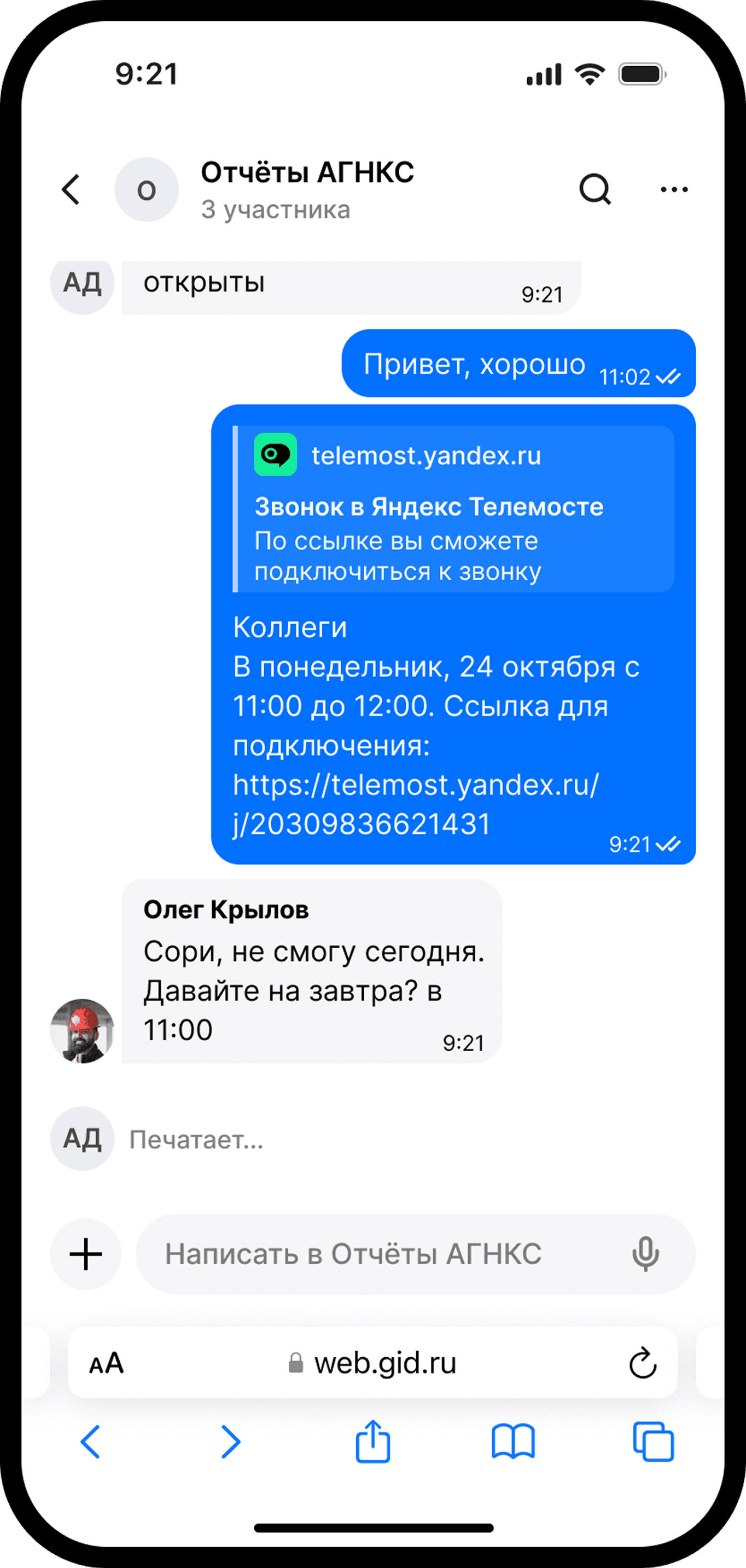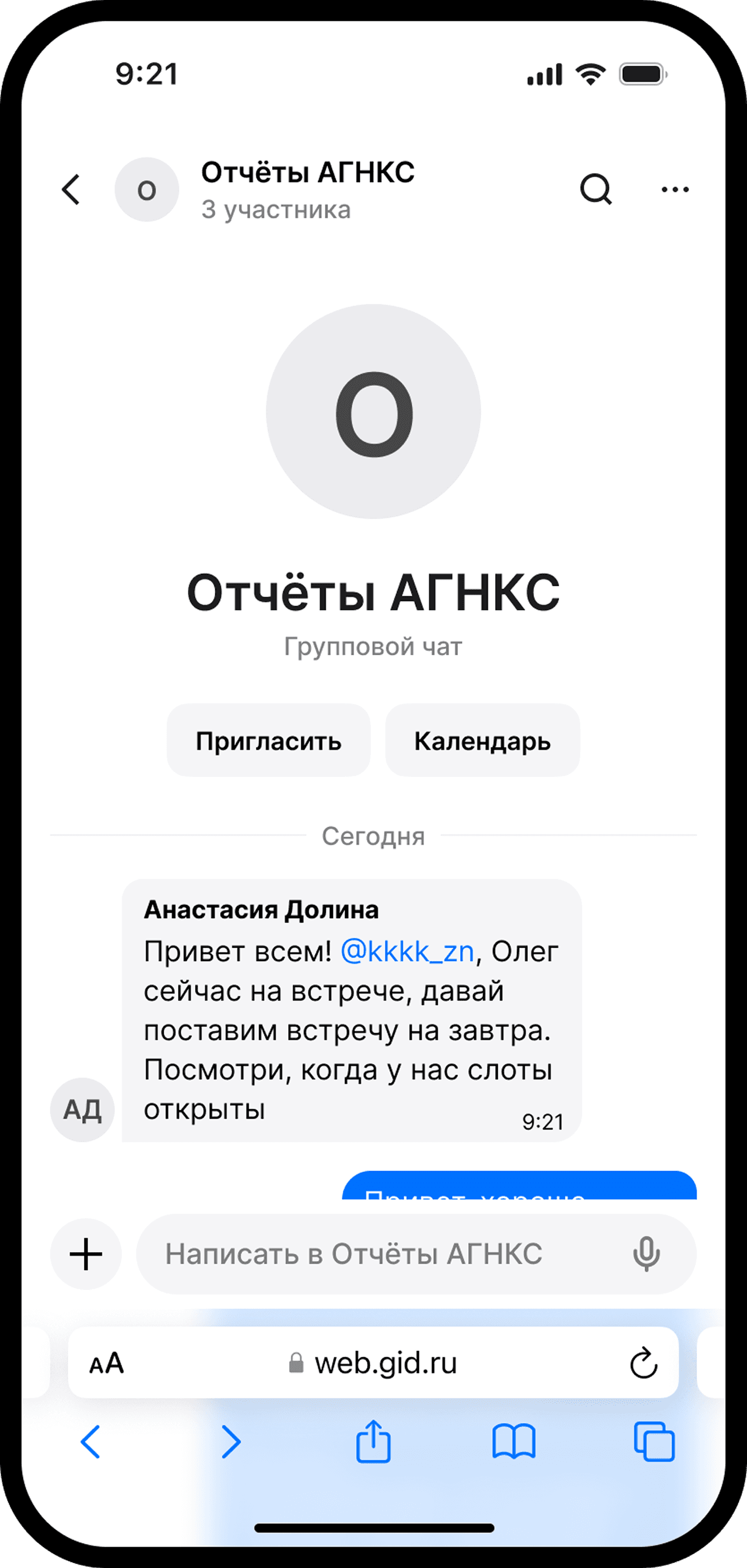 Если коллега недоступен прямо сейчас, встречу можно запланировать не выходя из группового чата — через встроенный календарь. Приглашение с датой, временем и ссылкой на подключение автоматически появляется в переписке.