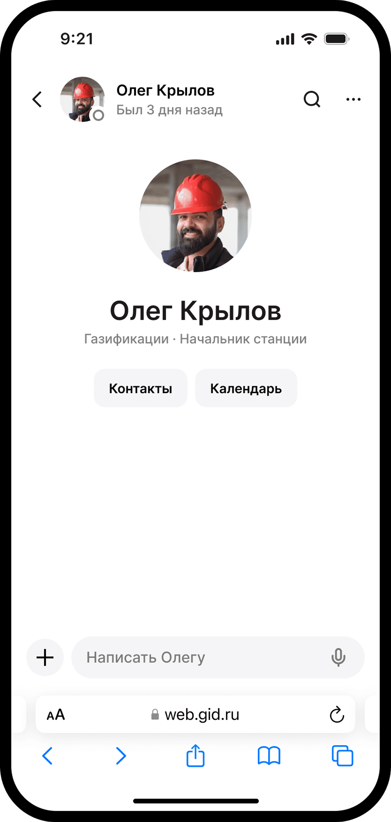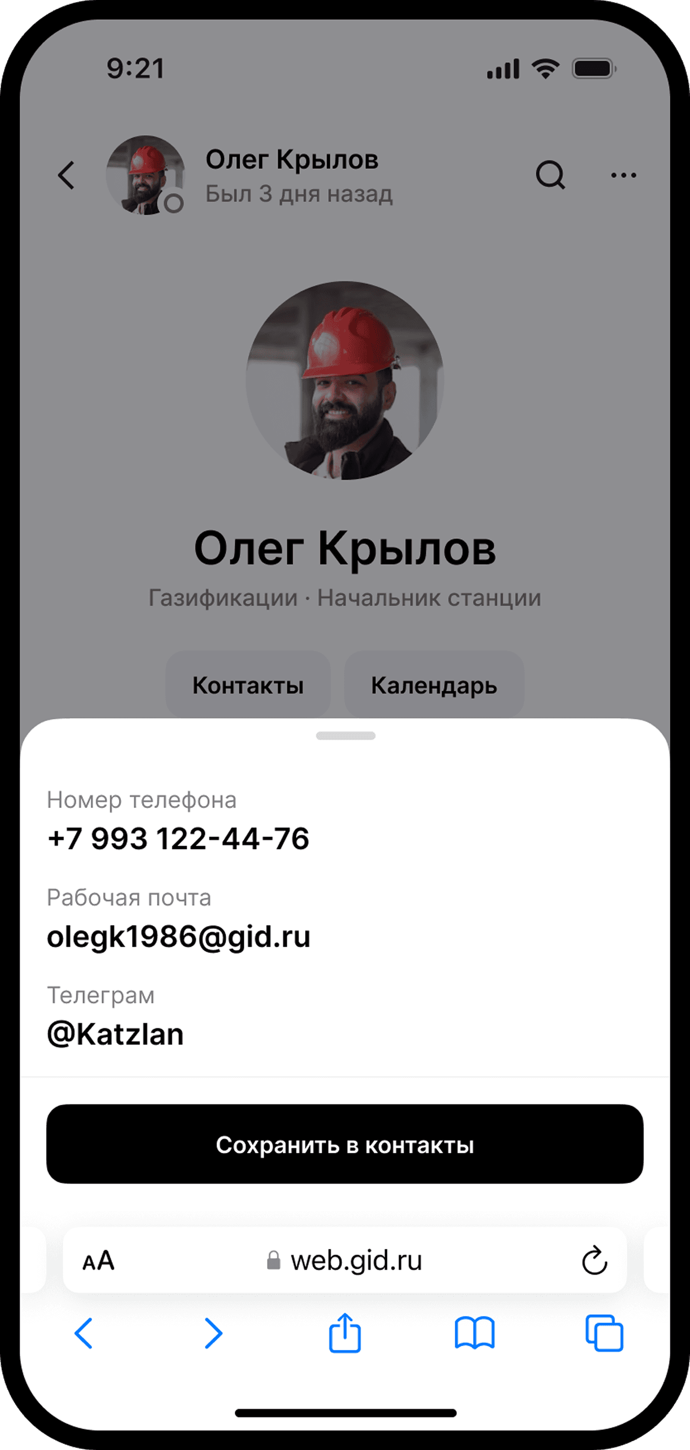 Если коллега не отвечает в чате, в его профиле собраны все рабочие контакты: телефон, корпоративная почта и Телеграм. Именно здесь можно найти то, что раньше приходилось искать вручную — или не удавалось найти вовсе. Все контакты сохраняются на телефон одной кнопкой.