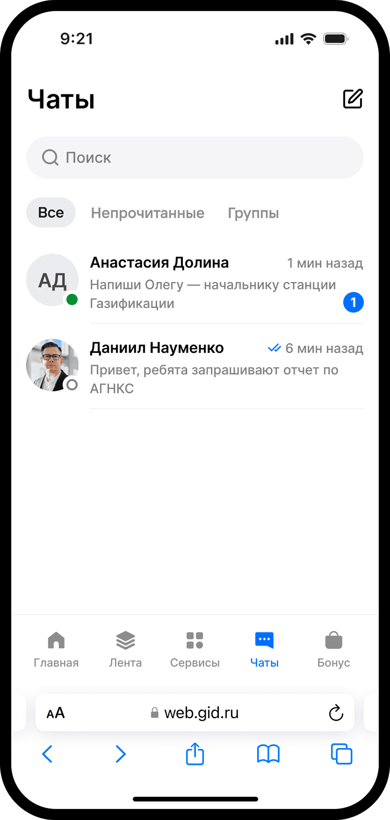 Поскольку учётная запись на web.gid.ru заводится при трудоустройстве, это единственная платформа, где есть все сотрудники без исключения. Решение — встроить в неё чат с автоматическим распределением по ролям и компаниям. При устройстве на работу сотрудник сразу оказывается в нужных чатах — без регистрации и лишних действий.